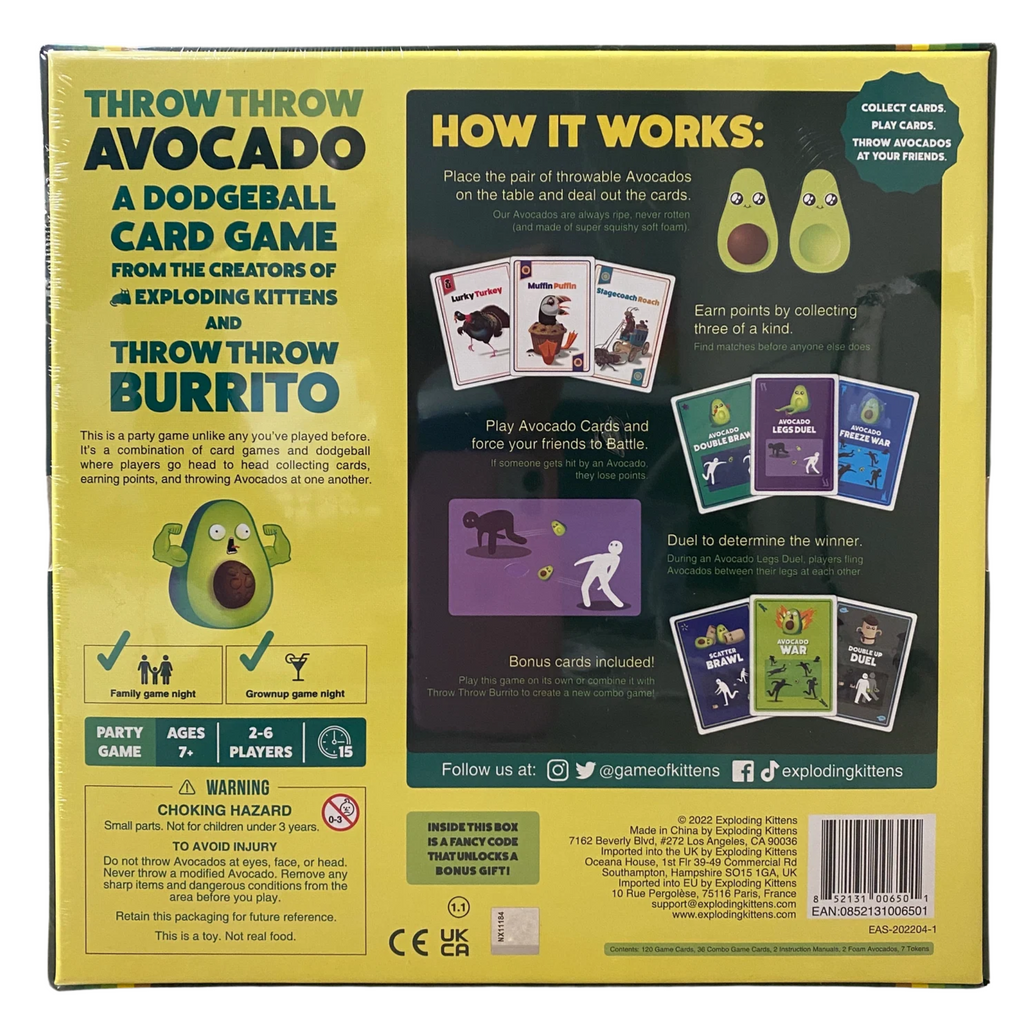 Contents: 120 Game Cards, 36 Combo Game Cards, 2 instruction Manuals, 2 Foam Avocados, 7 Tokens.